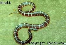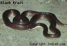 Common Krait (Bungarus caeruleus) is a smooth, glossy bluish-black snake with the rounded head slightly distinct from the neck. It is 1.0 to 1.8 m in length. The body color differs from blue-black, pale bluish-gray, steel blue, brown, and uniformly black. There are usually about 40 thin white cross bands. The base is white.