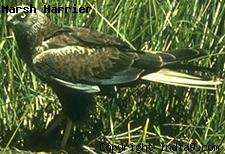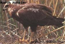 Marsh Harrier (Circus aeruginosus) is a medium-sized, slender hawk. It is also known as Western Marsh Harrier. The female is considerably larger than the male. They are identified by long, narrow, rounded tails, small beaks and long, slender legs. The most notable feature is the owl-like ruff of facial feathers that cover unusually large ear openings. Diet consists of small birds and mammals.