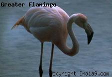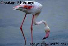 Greater Flamingo (Phoenicopterus ruber) is about 42 inches tall and has a wingspan of about five feet. It has a very long neck, long pink legs, pink feet and pink feathers. The bird has a large hooked bill with a black tip that is curved down. The wings have black tips.
