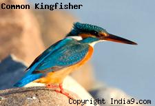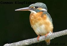 Common Kingfisher (Alcedo atthis) is very brightly colored. They have bright orange underparts with a white bib. The wings are bluish-green. The back, rump and tail are bright blue. Its head is blue with orange marks in front and behind the bird’s eyes and a white mark on each side of the head. The legs are short and orange in color. The females can be distinguished by the orange coloration on the lower part of its bill. The wings and tail are relatively short. The bill is long and pointed.