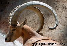 The male has a great beard and a coat of coarse brittle hairs. The dense under-fur of wool helps the animal to withstand the intense cold. The great scimitar-shaped horns of the buck are flat, and bossed with bold ridges in front. Height of male at shoulder is around 100 cm. The horns of males measures up to 100 to 115 cm around the curve.