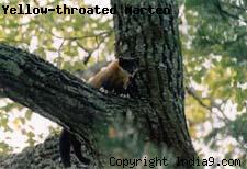 Yellow-throated Marten is a solitary animal with longer tail and limbs. Its chest, throat, lower jaw and side of the neck are creamy white deepening to a rich canary yellow color on the side of the neck. This yellow area contrasts sharply with the black fur on the upper parts of its neck.