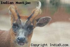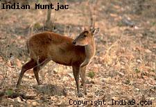 Indian Muntjac (Muntiacus muntjak) is a solitary animal, which is about 23 to 30 inches in height and weighs 40 to 60 pounds. Its color varies from deep brown to yellow or grayish brown with creamy or whitish markings.