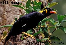 It is a noisy bird. The bird has a black, green and violet shimmering plumage. The orange colored bill and the yellow skin areas beneath and behind its eyes are common. Nest is constructed near human habitations. It often builds a loose nest of twigs, leaves, paper, and trash in a cavity or crevice. The bird feeds on fruits and berries, seeds, insects and lizards. The Hill Myna is omnivorous.