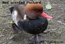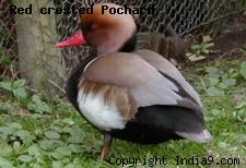 Haryana during winter. The remarkable feature of Red crested Pochard is its orange-brown head. The females, brown in color, have pale cheeks. The males have red beak and pale flanks. Diets include stems, roots and seeds of aquatic vegetation. The birds carry out three types of movements - dive, dabble and up-end - for collecting their food.