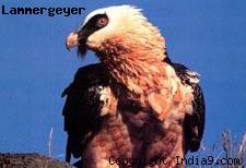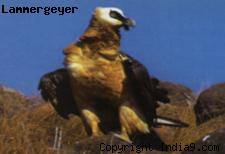 Lammergeyer (Gypaetus barbatus) is a magnificent bird, generally seen floating along a mountainside on wings, which may measure nine feet across. The whole length of the bird is from 43 to 46 inches. The top of the head is white, bounded by black. The rest of the head, the neck, throat and lower parts are usually clothed with lanceolate feathers of a pale tawny color.