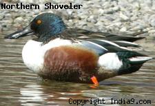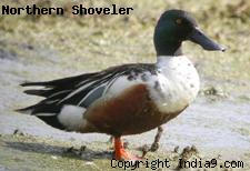 Northern Shoveler (Anas clypeata) is about 17 to 20 inches in size and has a characteristic large shovel-shaped bill. Males have green head, a white body, rusty-red under side and black wings. Females have mottled brown, black and white feathers and a blue patch on their wings.