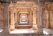 Adalaj Vav is a classic example of Indo-Islamic style of architecture. It consists of three sandstone-built entrances, which consist of octagonal landings with huge carved colonnades and intricately carved niches. Some of the pillars and walls show the influence of Buddhists, Jains and Solanki rulers of Gujarat. The carvings on the panels include that of a king sitting on a stool with two bearers, a scene depicting women churning buttermilk, musicians accompanying dancing women, and representations of various Hindu gods and goddesses.