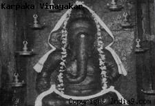 The temple enshrines a 6 ft idol of Karpaka Vinayaka. The deity faces north and is portrayed with two arms and a trunk curled towards his right, in the valampuri mode.