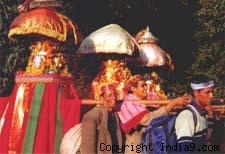 The festival begins on the day of Dashami, the tenth of the Ashwin month according to the Hindu calendar. It starts with the pulling of the chariot of