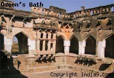 Karnataka. This structure features a very plain exterior but the interior is elaborately adorned with arched passages, projecting balconies and lotus-shaped fountains which used to gush perfumed water for the ladies of the court.
