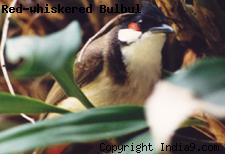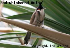Red-whiskered Bulbul (Pycnonotus jocosus) has a lean body, short neck, sharp beak curved at the tip, and short hair above and below the beak. The upperparts are brownish with white cheeks and breast. The bird is noticeable because of its tall-black crest and the thick black stripe running from its beak to neckline.